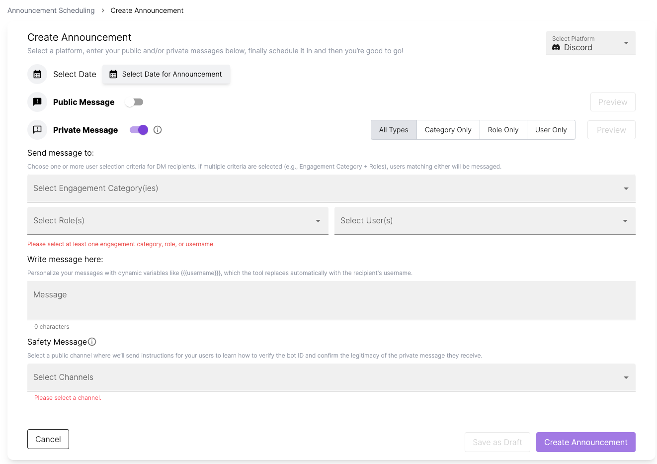 1. Select **who** should be getting the announcement. You can select members by their engagement level, discord role, or user name. You have to select at least one criteria.&#x20;