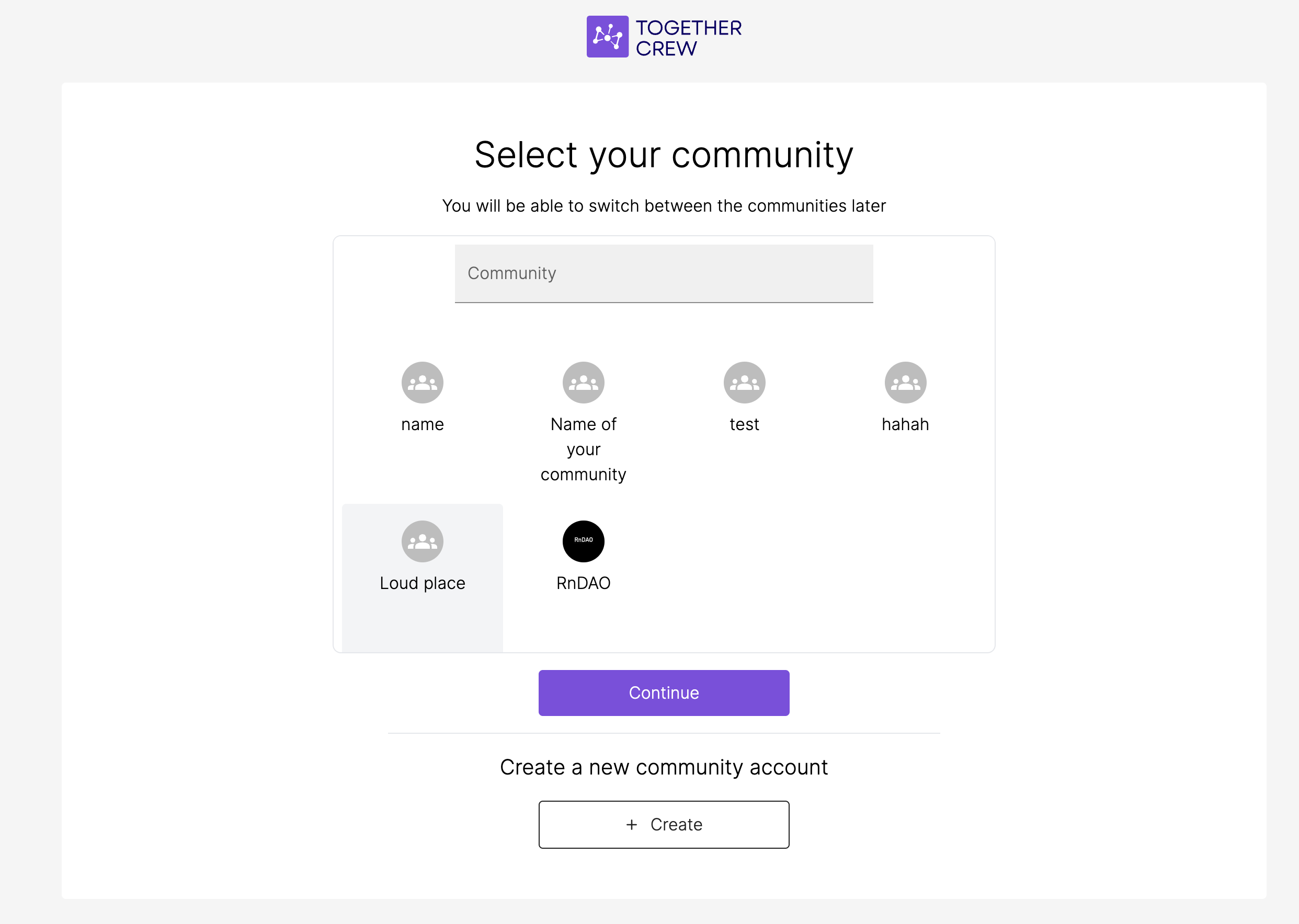 If you are the first one to create an account on TogetherCrew for your community, select **+ Create**. On the following screen add a name for your community and select **Create community.**